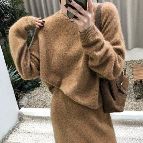 TEMU 2025신상 2pcs 여성 가을 라운드넥 꽈베기 니트 하이웨스트 니트스커트 투피스세트 빅사이즈 편한 캐주얼 날씬해보이는 코디세트 LKS-20