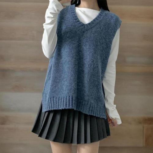 [신상오픈런]여성 언발란스 루즈핏 브이넥 기본 오버핏 사이드 슬릿 니트 조끼