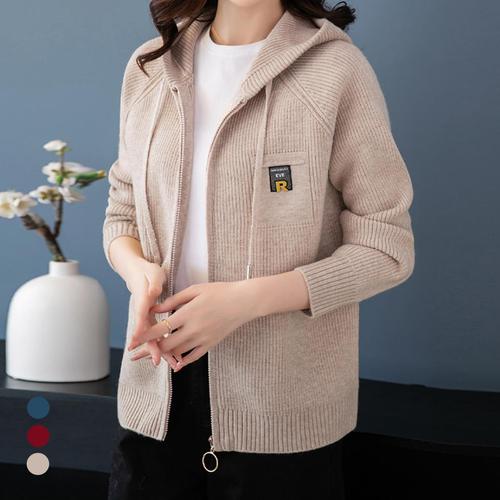 Talenza 겨울 여성 스웨터 후드 가디건 푹신한 지퍼 패치 워크 긴 소매 리브 솔리드 니트 자켓 코트 여성용 카디건