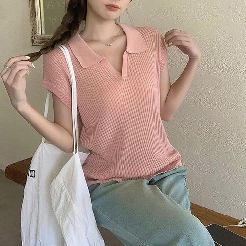 브이넥 골지 카라 니트 티셔츠 여성 데일리 반팔티