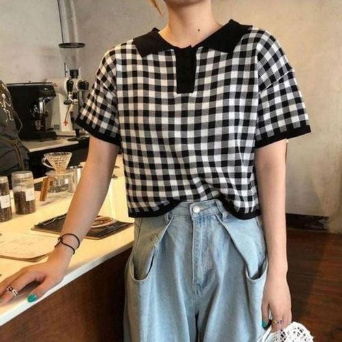 [에이치플러스몰]반크롭 여성 캐주얼 카라 니트 필수템 체크 반팔티 1P