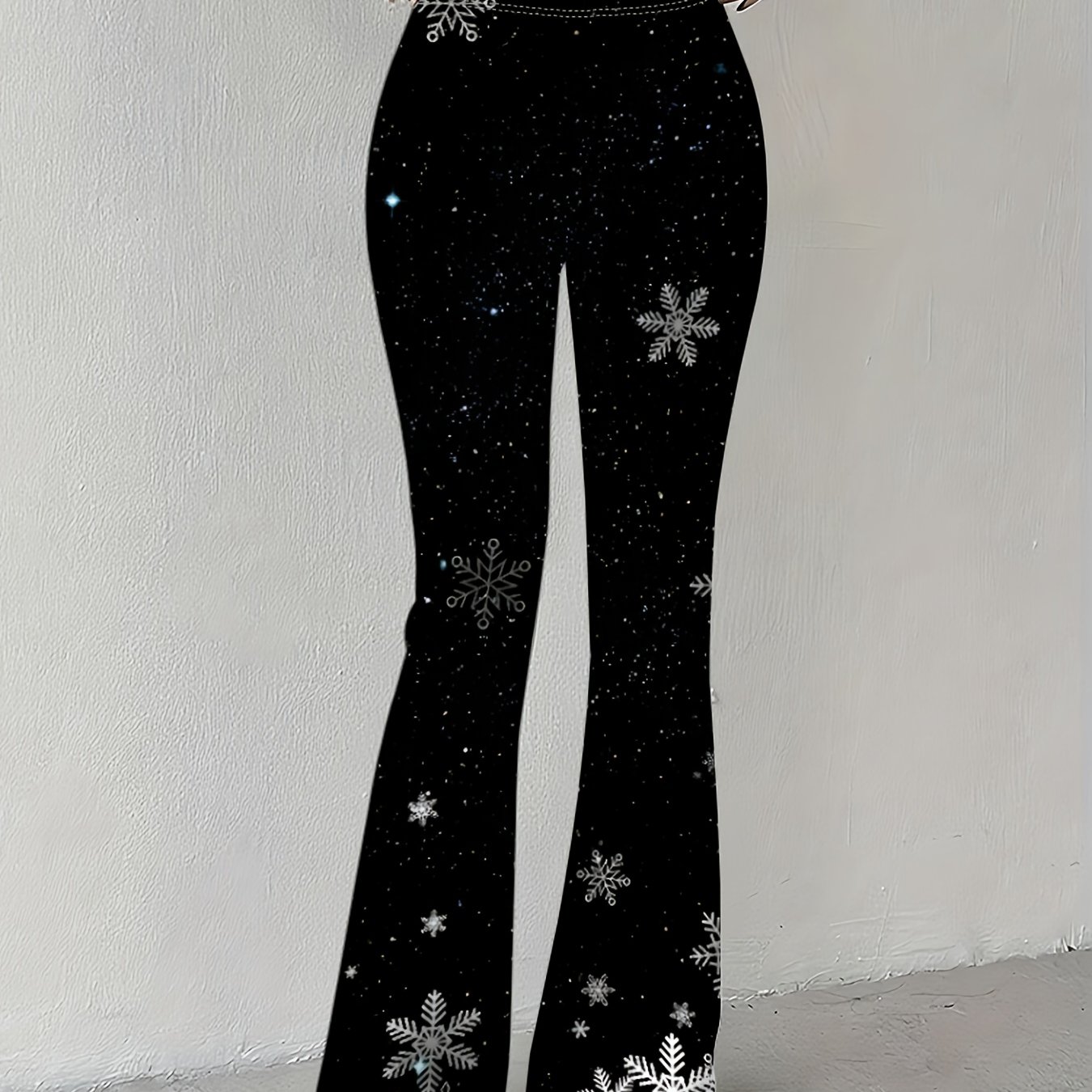 TEMU 여성용 하이웨이스트 와이드 레그 플레어 벨바텀 팬츠 - 눈꽃 프린트 텀미 컨트롤 슬림핏 스트레치 트라우저, 겨울 화이트 & 다크 네이비 스타 디자인, 캐주얼부터 포멀웨어까지 사계절용