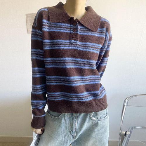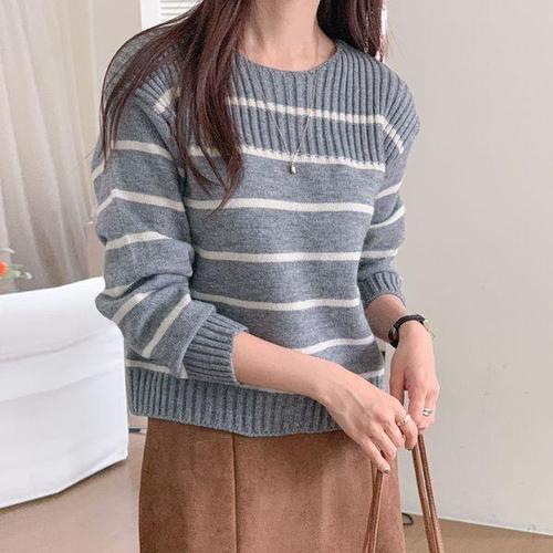 [유야]라운드넥 단가라 니트 긴팔티 -NT0165H- 여성 가을 겨울