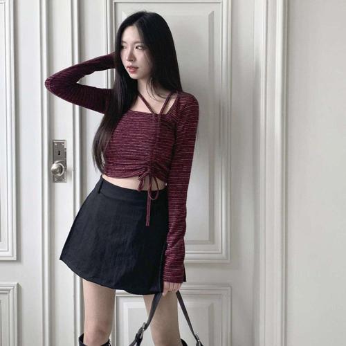 [옷자락] 여성 심플 스트라이프 홀터 크롭 긴팔티