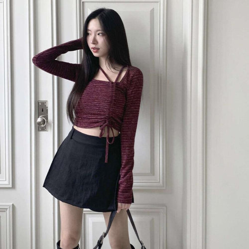 [옷자락]여성 심플 스트라이프 홀터 크롭 긴팔티