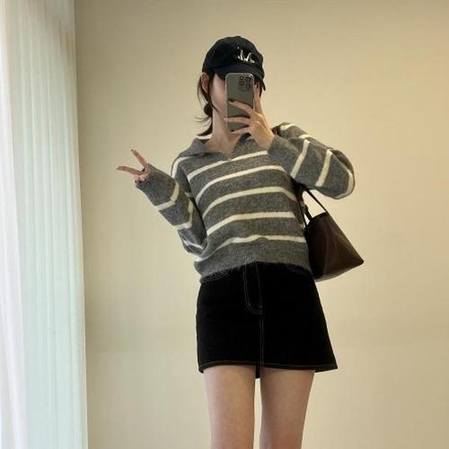 여자 스트라이프 오픈카라넥 세미크롭 겨울 긴팔 니트