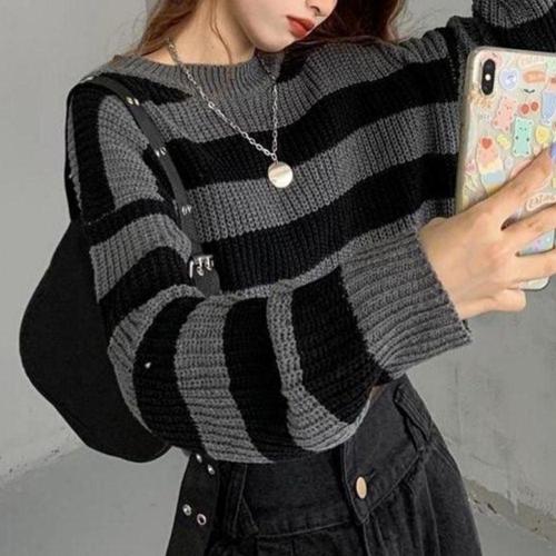 여성 캐주얼 루즈핏 긴팔 단가라 스트라이프 크롭 니트 WFL06N3