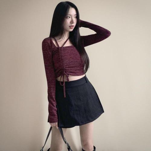 [옷자락] 여성 심플 스트라이프 홀터 크롭 긴팔티
