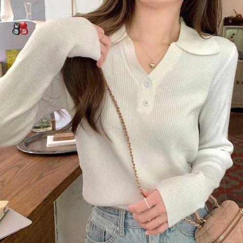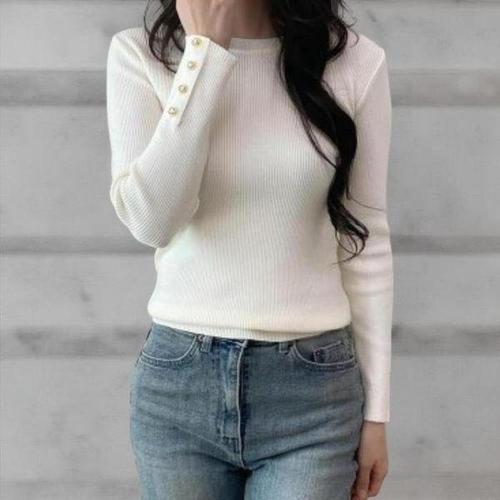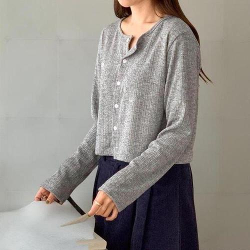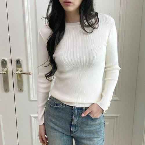 옆단추 여성 니트티 라운드넥 여자 골지 긴팔 티셔츠