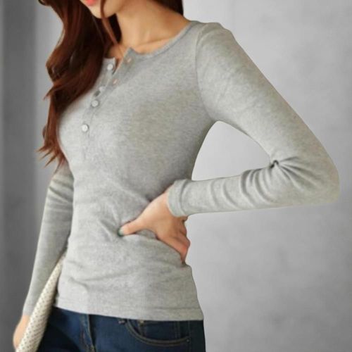 [다잇템_패션]여성 신축성 소매단추 롱슬리브 골지 티셔츠