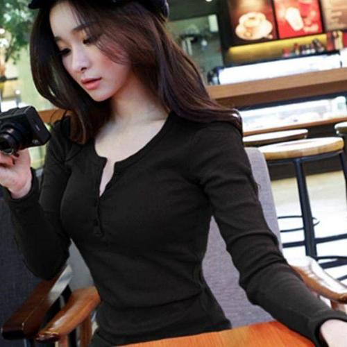 [다잇템_패션]여자 U넥 롱슬리브 핏 버튼 골지 티셔츠