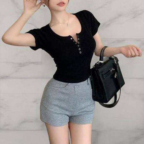 [다잇템_패션]여성 반소매 단추 핏 골지 민무늬 티셔츠