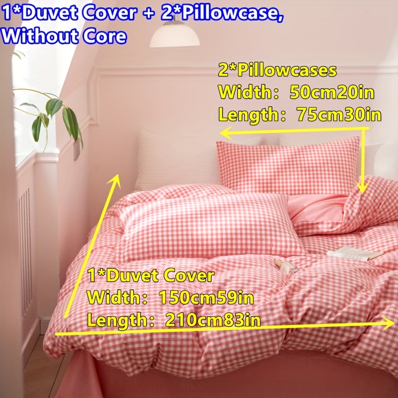 TEMU 3pcs 핑크 소형 그리드 패턴 이불 커버 세트, 모던 직물 프린트 이불 커버 및 베개 커버, 1 이불 커버 + 2 베개 커버, 가정 침구에 적합, 모든 계절 사용, 기계 세탁 가능