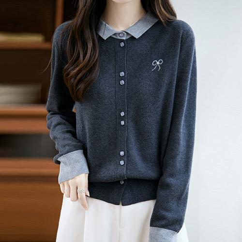 [유니제이] 오번 자수 포인트 배색 가디건