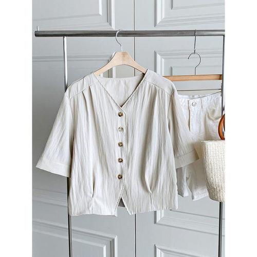[샵앤]여성 V넥 단추 오픈 심플 데일리 여름 반팔 자켓 BONG-WJK-4520-베이지