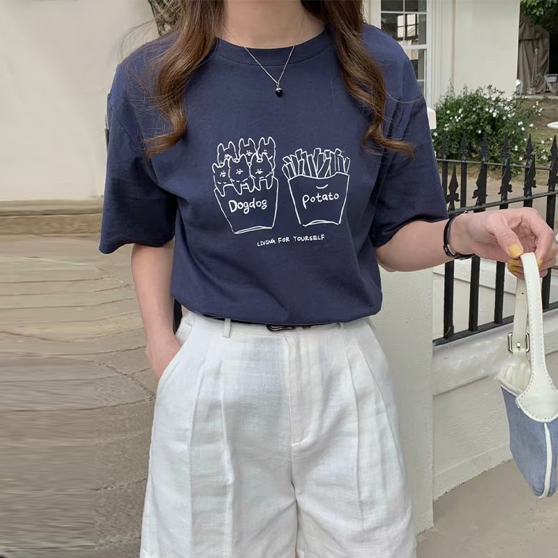 도그프린팅 캐주얼 여름 티셔츠 라운드넥 여성 반팔티