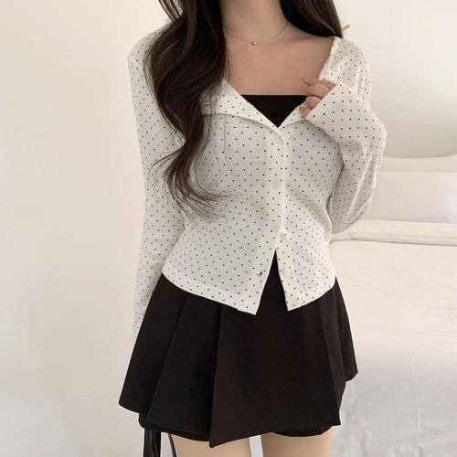 [신상오픈런]여성용 봄 여름 코튼 점프 도트 슬림핏 세미 크롭 가디건