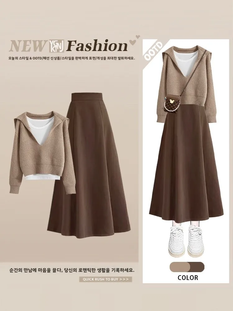 레트로 니트 스웨터 세트 하이웨이스트 슬릿 스커트 3피스 여성 패션 앙상블 가을 캐주얼 V넥 긴팔