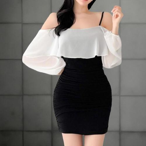 [신상오픈런]여성 오프숄더 쉬폰 미니 드레스 배색 셔링 원피스