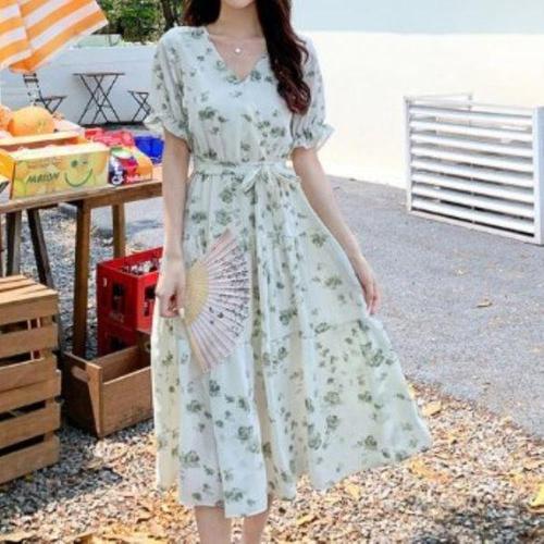 [신상오픈런]여성용 플로랄 패턴 허리 스트랩 쉬폰 반팔 롱드레스