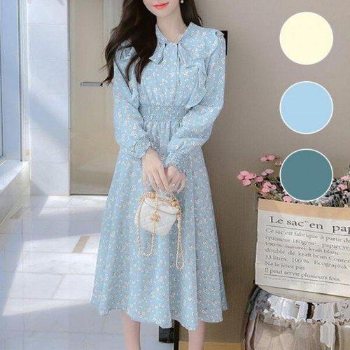 [모노무드]모노무드 마라노파 긴팔 롱 드레스 쉬폰 리본 프릴 여성 꽃무늬 원 GWM
