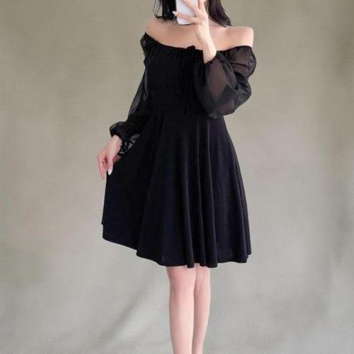 [신상오픈런]여성 오프숄더 프릴 쉬폰 긴팔 미디 드레스