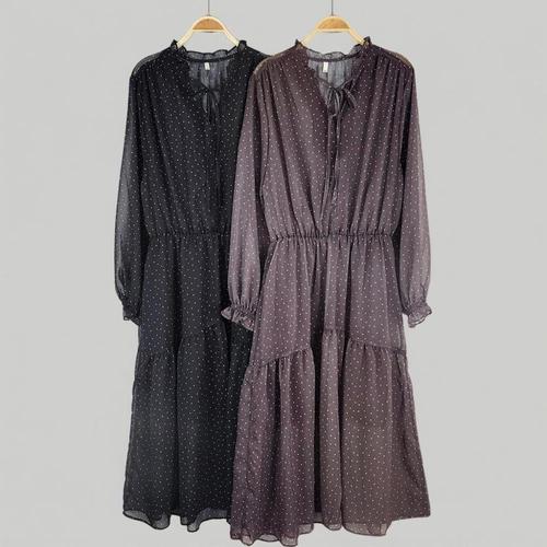 [옷자락]여성 가을시즌 시스루 쉬폰 리본 캉캉 도트 롱드레스