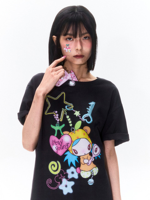 [키르시] 락 체리 그래픽 루즈핏 티셔츠 [블랙]
