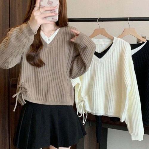 [셀럽하우스]데일리 LXMI6011 코디 여성 레이스업 두톤 딥브이넥 골지 니트