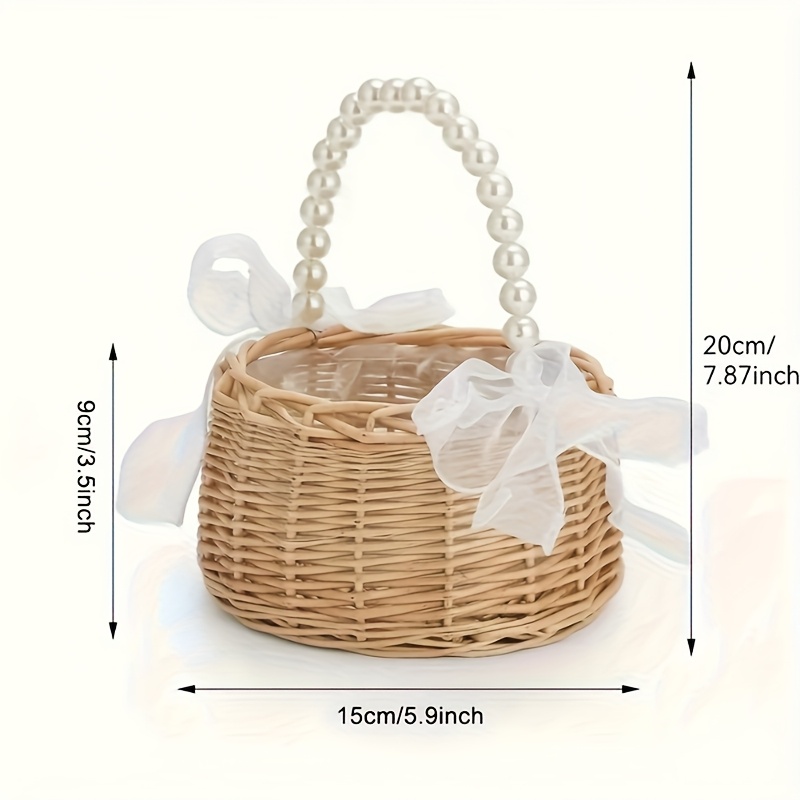 TEMU 펄 손잡이와 리본 장식이 있는 손으로 짠 꽃 바구니 | 결혼식, 약혼, 부활절, 파티 선물, 장식용 다용도, 모던 원형 고임성 바구니