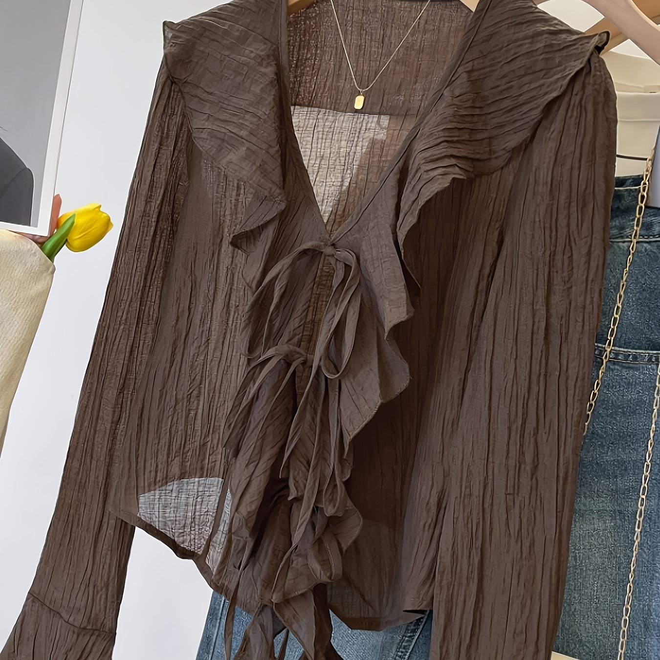 TEMU 여성용 긴팔 타이 사이드 버튼 V넥 라펠 칼라 블라우스 캐주얼 솔리드 컬러 루즈핏 셔츠|블라우스|여름블라우스|여성블라우스