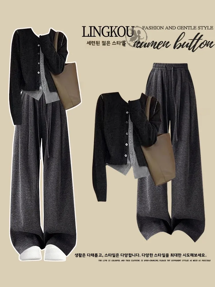 한국 스타일 여성 니트 스웨터 가디건 캐주얼 루즈핏 바지 투피스 세트 가을 패션 앙상블 긴팔 라운드넥