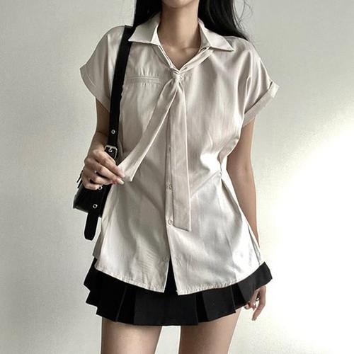 [라이니]스트랩 슬림 리본 퍼프 반팔 블라우스 to-2541d