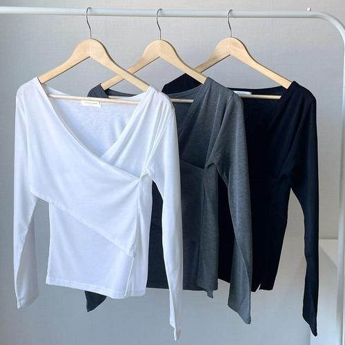 [신상오픈런]여성 레이어드 랩 오프숄더 긴팔 크롭 티셔츠 옆트임