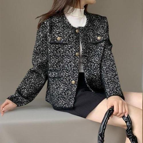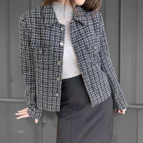 [신상오픈런]여성용 클래식 트위드 자켓 골드 버튼 더블 포켓 노카라 스타일