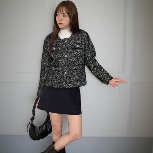 [신상오픈런]여성용 금장 버튼 장식 퍼 트위드 노카라 자켓