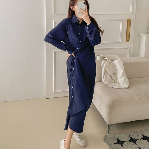플러리싱 / 클래식 카라넥 레이온 롱 셔츠 원피스 플러리싱