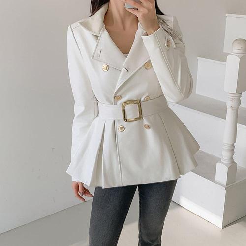 [옷자락] 여자 겨울 더블버튼 금장 벨트 하이넥 프릴 가죽 자켓