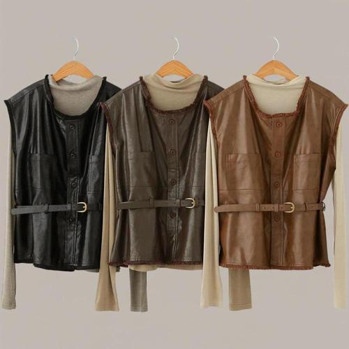 |CSD2774|여성 가죽 자켓 수술 포켓 벨트 버튼 목폴라 세트