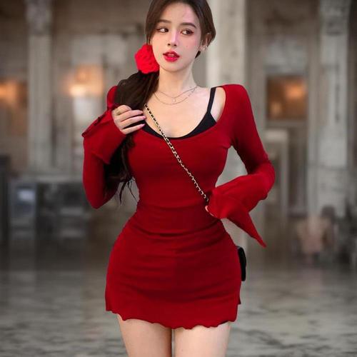[옷자락] 여성 이너탑 레이어드 유넥 레드 니트 미니 드레스