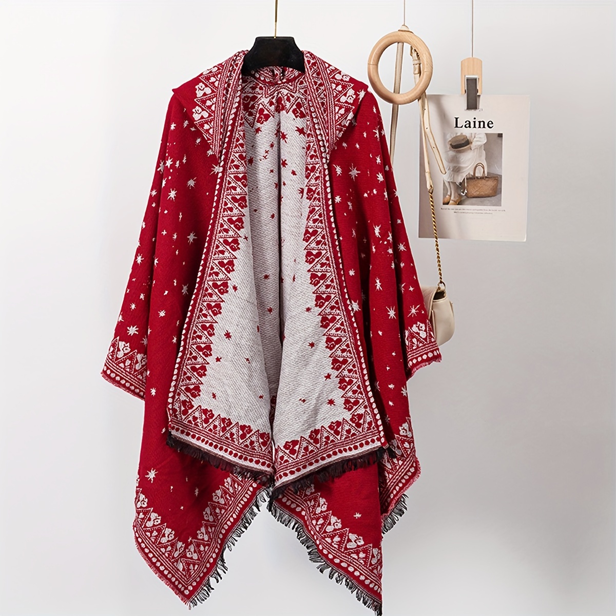 TEMU 여성용 레트로 기하학 스타 프린트 프린지 트림 숄 - 캐주얼 외출용 가벼운 세탁 가능한 장식 랩, 밝은 핑크/오렌지/레드/블루//블랙, 민소매 드레스용 샤울, 다재다능한 패션 액세서리, 우아한 드레이프 디자인, 정교한 패턴 공예