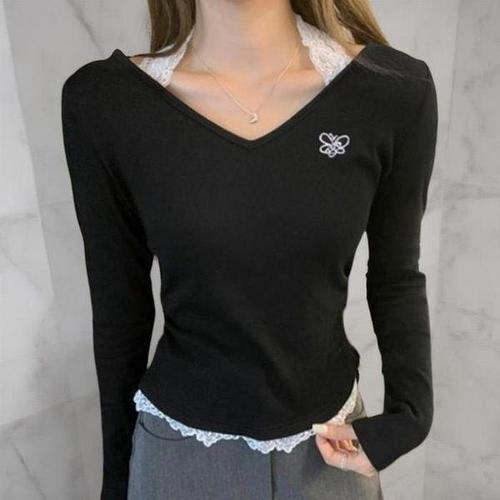 [다잇템]여성 코디 레이스 V넥 롱슬리브 티셔츠