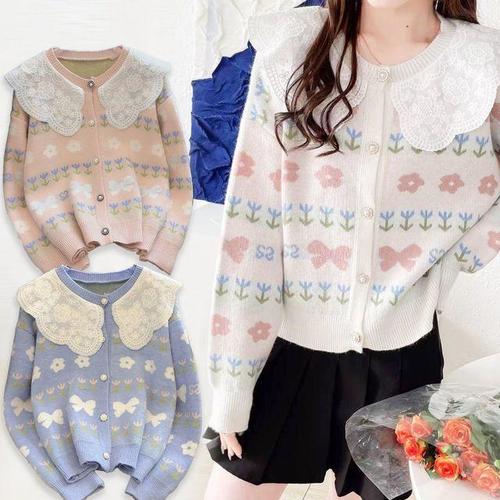 [모노무드]LMO 여성용 춘절기 폴플로럴프린트 올데이 롱티 레이스소재 니트웨어 오픈니트