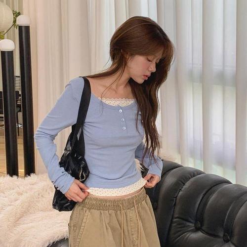 [옷자락]여자 레이스타이 셔링 단추 슬림핏 롱슬리브 티셔츠