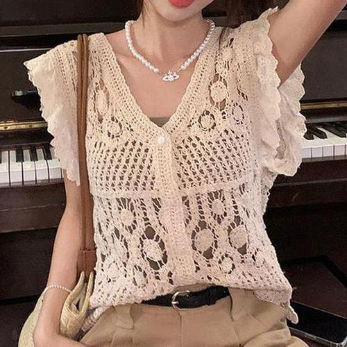 [에이치플러스몰]2컬러 자수 레이스 뜨개 단추 오픈 베스트 MA8209