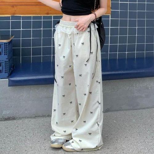 [에이치플러스몰]여성 캐주얼 하이웨스트 레이스 리본 패턴 와이드팬츠