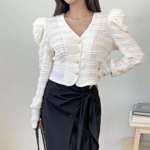 [다잇템]여성 출근룩 프릴 벌룬 소매 트위드 V넥 가디건