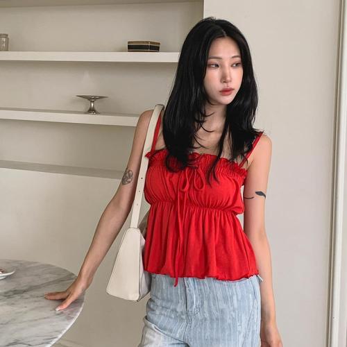 [다잇템]여자 리본스트랩 프릴 잔주름 핀턱 나시티