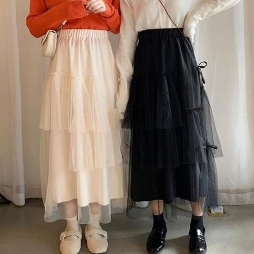 [엄지척]여자 귀여운 옆리본 장식 망사 롱스커트 3단 레이스_19958427_667501