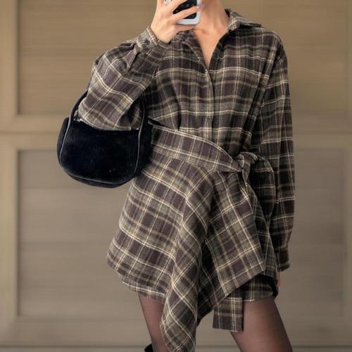 [미라클세븐]여성 레이어드 플레어 랩 스커트 체크 블라우스 미니 드레스